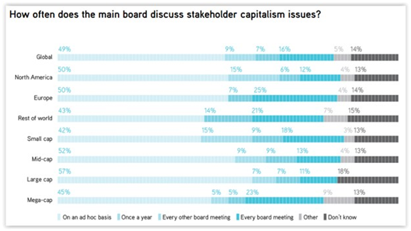 - Consistent with the foregoing, while only 17% of North America respondents characterized stakeholder capitalism issues as very or extremely important to their investors, this compares to 53% of global mega-cap respondents and just 16% of global large-cap respondents.