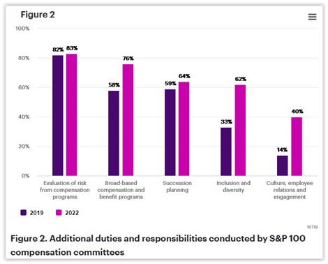 The 2019 study identified five common or emerging non-traditional areas of compensation committee responsibility based on a review of committee charters among the largest 100 S&P 500 companies. The firm’s 2022 review of compensation committee charters across the largest 100 showed an increase in prevalence of compensation committee responsibility across all five areas, as depicted here: