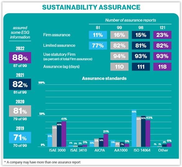- Nearly 88% of US companies obtained assurance over some reported ESG information in 2022, compared to an average of about 69% worldwide.
