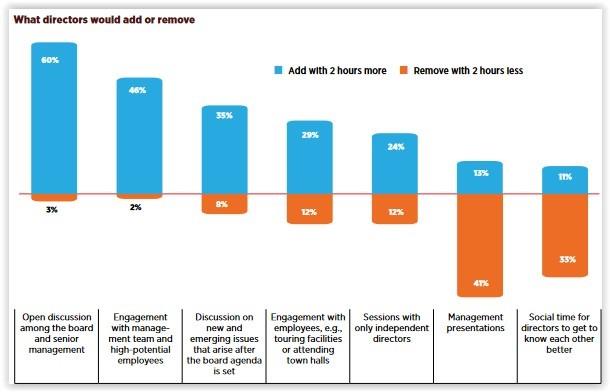 Among the key takeaways for corporate governance professionals: More than 40% of directors would reduce time spent on management presentations if board meetings were two hours shorter, while 33% would reduce social time for directors to get to know each other better. This compares to 13% and 11% of directors who would increase time spent on management presentations and social time with other directors, respectively. As for the former, the report suggests baking management presentations into the board’s pre-read materials so as to not consume live meeting time that may be better spent on substantive discussion.