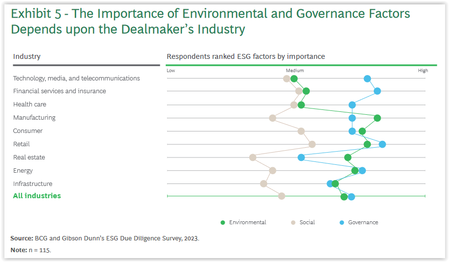 Among the noteworthy findings from a survey of 115 dealmakers in Europe, North America (including the US), South America, and Asia, conducted by BCG and Gibson Dunn, aimed at better understanding ESG due diligence practices, are those relating to industry-specific priorities across "E," "S," and "G" factors.