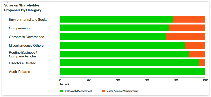 By shareholder proposal category, it voted against management’s recommendations most frequently on corporate governance and compensation-related proposals.