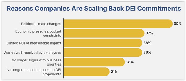 - Bases for reducing or eliminating DEI programs vary; however, about half attribute their actions to the political climate: