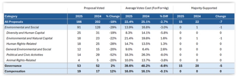 The average support for shareholder proposals overall is 22.4% compared to 22.9% for full season 2024, with Proxy Analytics expecting potential reduced support as the season unfolds, as was the case in 2024.