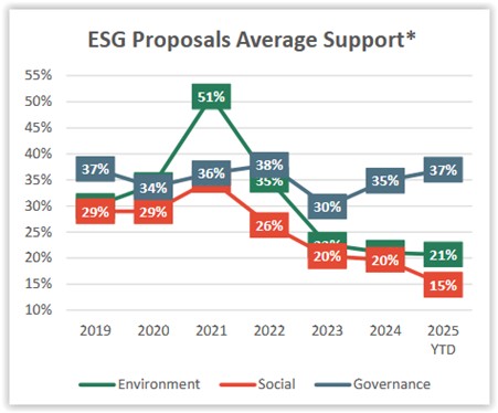 Notably, support for environmental and social proposals has declined appreciably since the peak in 2021, while support for governance proposals has remained relatively steady since 2019.