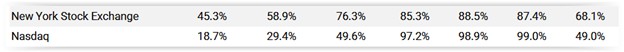 Notably, with the elimination of its board diversity disclosure requirement, disclosure of at least one quantitative measure of board diversity among Nasdaq companies declined 50% season-over-season, compared to a decline of about 20% for NYSE companies.