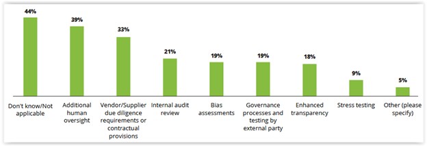 Risk mitigation (n=57) — Those companies that have adopted/implemented risk mitigation measures relative to AI most commonly identified measures involving additional human oversight and vendor/supplier due diligence requirements or contractual provisions.