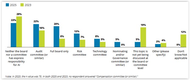Board oversight structure (n=60) — A slight plurality of respondents—23%—said that neither the board nor a board committee has express responsibility for AI, whereas 22% allocate primary oversight to the audit committee and 20% retain responsibility at the full board level.