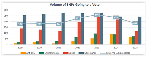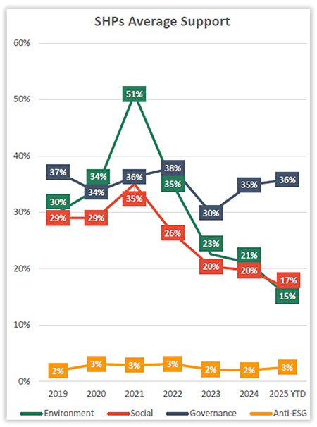 Also reported on page 7 of the report are the percentages of environmental, social, and governance proposals supported by each of ISS and Glass Lewis for the season year-to-date compared to the 2023 and 2024 seasons. ISS’s support for environmental and social proposals declined sharply from 2024 to 2025 season-to-date and increased for governance proposals, while Glass Lewis’s support declined for environmental proposals and increased for social and governance proposals. The difference in support for social proposals in particular is dramatic, with ISS supporting 24% compared to Glass Lewis’s 45% support of such proposals.