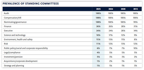Always a topic of keen interest, here is the breakdown on board committee structures in 2025 as compared to 2024 and five and 10 years ago: