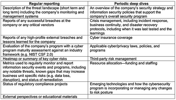 Among other tangible action items suggested in PwC’s “The board’s role in overseeing cybersecurity” is management’s regular reporting to the board, fostered by an annual cyber calendar (consistent with the annual board and committee calendars corporate secretaries typically develop to organize other required activities) (p13) and inclusive of a cyber dashboard or scorecard (illustrated here on p6) to help the board understand and evaluate current risks, monitor trends, and track the company’s progress against specific metrics.