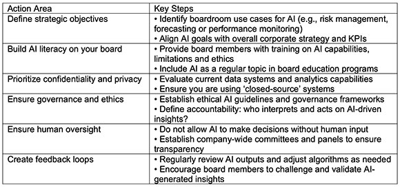 - Embed human oversight — Ensure AI outputs are reviewed and validated before inclusion in board materials or decision-making.