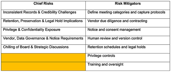 Aimed at corporate secretaries, GCs and other in-house counsel, compliance personnel, and other in-house practitioners, “When every word is recorded: AI meeting tools and the new governance risks” from White & Case succinctly and effectively outlines the chief governance and legal risks associated with the use of AI tools in the boardroom and other meetings and suggests sound action items to mitigate the risks.
