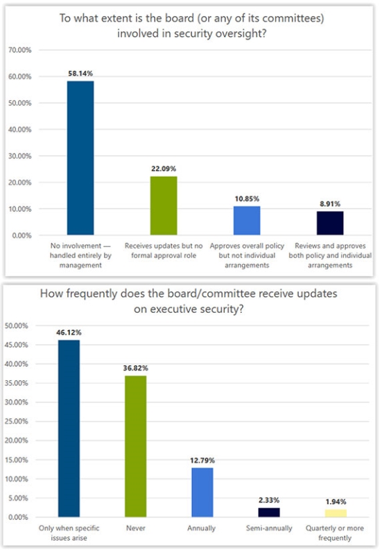 Board oversight – The majority of boards have no involvement in overseeing executive security and rarely receive updates (either at the board or committee level). The firm notes that the data suggests potential vulnerability, with companies treating security as an operational item rather than a governance risk.