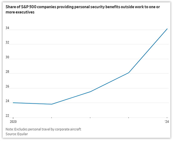Prevalence—The prevalence of S&P 500 companies disclosing executive security-related perks increased 6% year-over-year through the end of fiscal 2024 (based on 2025 proxy filings), and from 24% in fiscal 2020 to 34.1% in fiscal 2024.