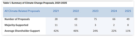 - In the 2025 proxy season (January 1 – June 30, 2025), climate-related proposals made up more than 75% of all environmental shareholder proposals; however, no climate-related proposals – or environmental proposals more broadly – received majority shareholder approval.