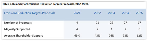 - Average support for proposals on emissions reductions targets dropped by more than half season-over-season to 12% in 2025, and, unlike prior years, no such proposals received majority shareholder support.