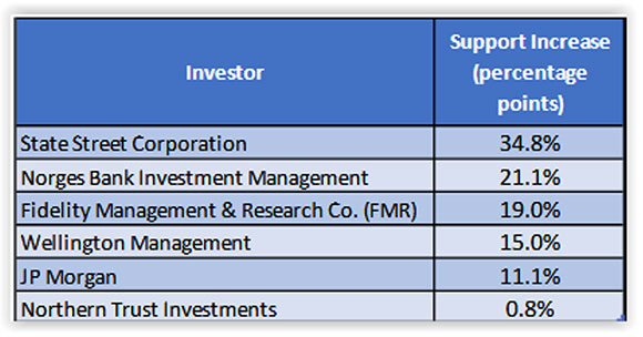 Among the Big Three, BlackRock supported three; Vanguard supported zero; and State Street supported 10, of 13 proposals voted. Of the largest 16 asset managers, which include the Big Three (≥ $1 trillion AUM), six (including State Street) increased their support season-over-season, as shown here: