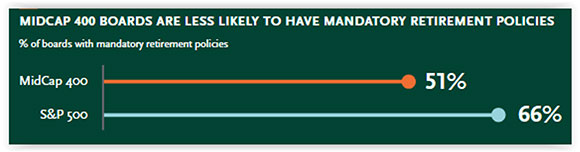 Refreshment tools—Although the average age limits are comparable (~age 74), as compared to the S&P 500, mid-caps are much less likely to have mandatory retirement policies: