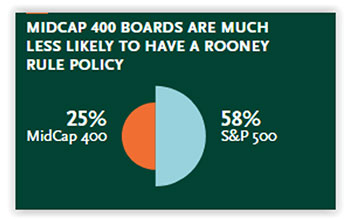 Board diversity mechanisms—Mid-cap boards are much less likely than the S&P 500 to have a Rooney Rule policy or commitment to include diverse candidates in director searches: