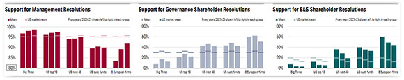 The numerous bar charts in this report from Morningstar illustrate clear variations and patterns and year-over-year trends in voting support for discrete shareholder proposal type by investor group for Morningstar US Large-Mid Cap Index companies for the three proxy years ended June 30, 2025.