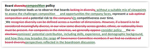 Consistent with what we have seen from BlackRock and Vanguard, T. Rowe Price’s updated proxy guidelines eliminate director gender, ethnicity, and nationality expectations in favor of broader viewpoint diversity, as shown by this redline excerpt against its 2025 board diversity policy: