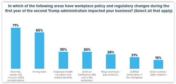 According to Littler’s recently released Annual Employer Survey report, most companies report being impacted by the Trump administration’s policy and regulatory changes, 71% citing effects from DEI-related developments and 65% from immigration—as shown here: