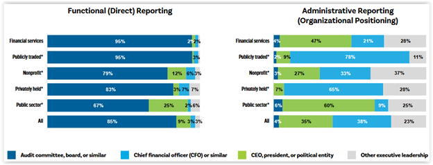 Consistent with recommended best practice, most CAEs have a direct / functional reporting relationship with the board, most commonly, the audit committee, while administrative reporting practices vary fairly considerably by and across organization types, as shown here:
