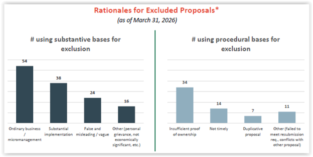 Notably with regard to the SEC’s recent shift in managing Rule 14a-8 no-action requests, the firm reports 133 companies having excluded 163 proposals as of March 31 since the November 17, 2025, announcement. The following bar charts show the bases for exclusions as of that date, with many proposals citing more than one procedural and/or substantive basis for exclusion: