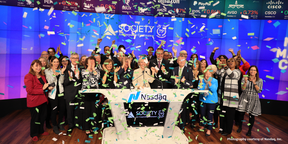 New York City, November 1, 2021 – The Society for Corporate Governance celebrates its 75th anniversary this week with a Nasdaq Closing Bell ringing today by Society President & CEO, Darla Stuckey; Society Chair, Jeffrey Pochowicz, Senior Director – Corporate Governance & Assistant Corporate Secretary, McDonald’s Corporation; and other former Chairs. On November 6, 1946, a group of business leaders met to form the American Society of Corporate Secretaries, which has evolved into a growing, robust, and diverse national association for corporate governance professionals now known as the Society for Corporate Governance.